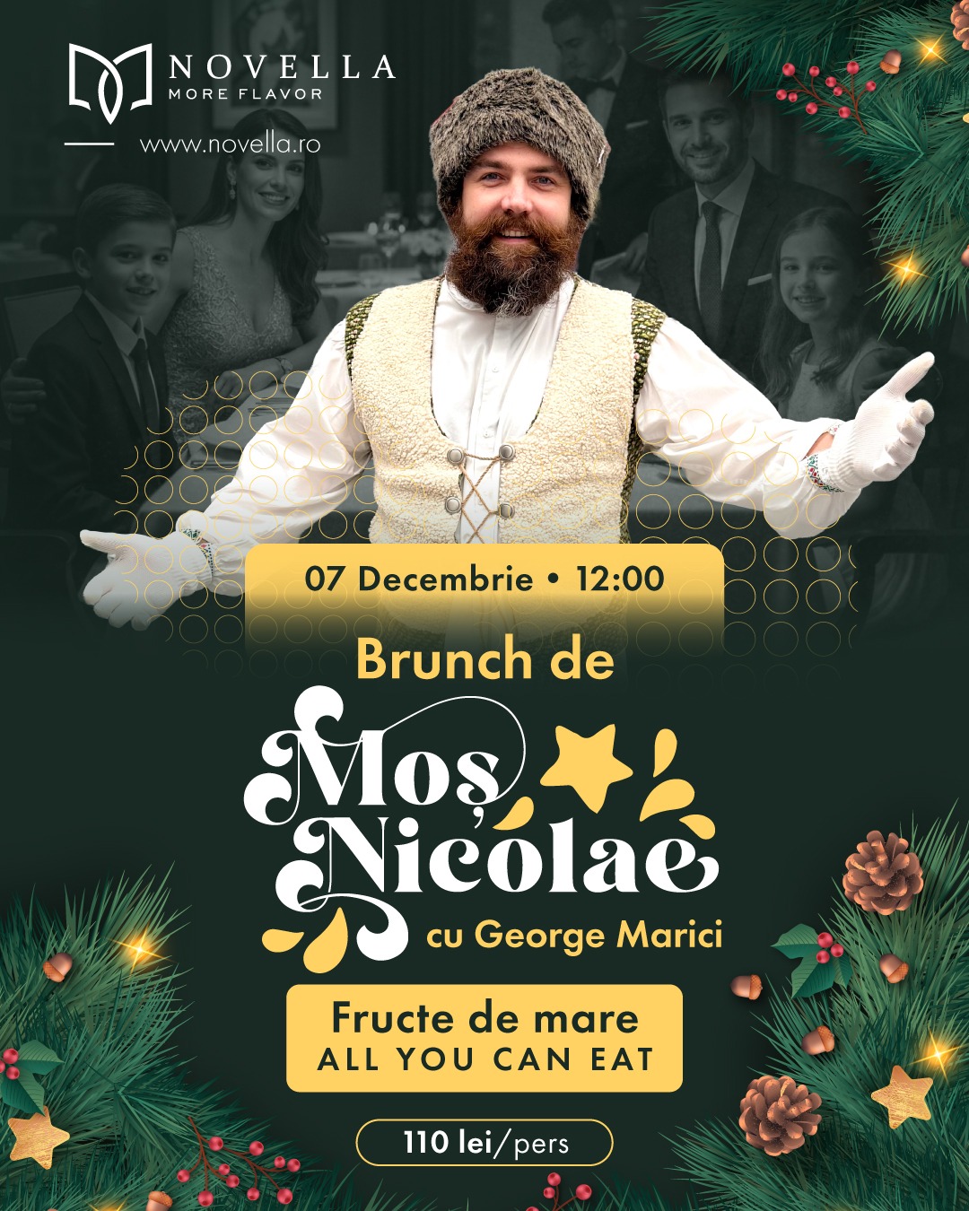 Brunch-ul All You Can Eat de duminică, 7 decembrie, te așteaptă cu arome irezistibile și o atmosferă relaxantă. Momentul special al zilei îl aduce George Marici, care va anima brunch-ul și va transforma începutul sezonului festiv într-o experiență memorabilă atât pentru cei mici, cât și pentru cei mari. Savurează ciorbă pescărească, pește prăjit cu mămăliguță și mujdei, fritto misto cu sos aioli, cartofi prăjiți, coaste de porc cu barbeque și dovlecei la grătar. La final, deserturile noastre te așteaptă: salam de biscuiți și orez cu lapte și caramel sărat. Vă așteptăm, duminică, 7 decembrie 2025, între orele 12:00 – 13:30 – dar nu vă grăbiți să plecați! Stați cât doriți să vă bucurați de brunch și de relaxare în stil Novella. Rezervă-ți locul acum pentru a te asigura că vei avea parte de o experiență culinară memorabilă!